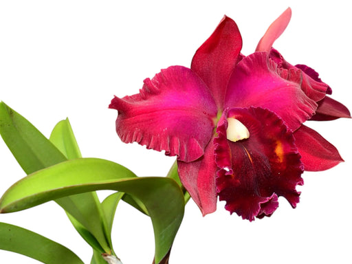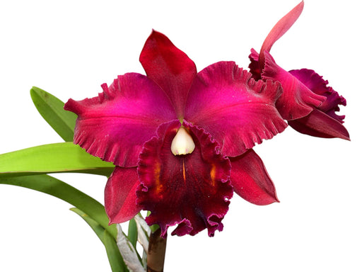 This distinctive hybrid orchid, a cross between Rlc. Carmen and Rlc. Chia Lin, showcases vibrant magenta petals and sepals contrasting against an i...