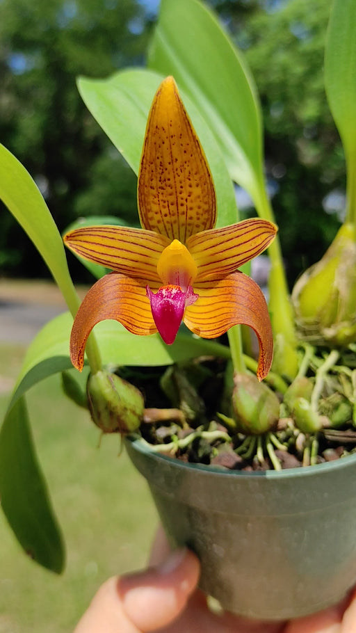 This striking epiphytic orchid species is celebrated for its large intricate flowers with deep maroon and yellow coloration and distinctive protrud...
