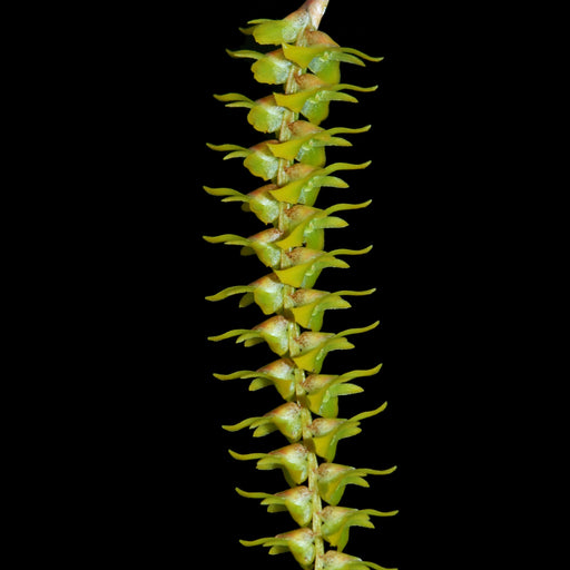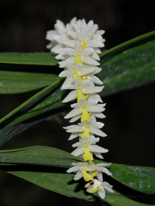 It is a charming epiphytic orchid found in Panama and other parts of Central America. It boasts slender, elongated leaves and delicate, greenish-wh...
