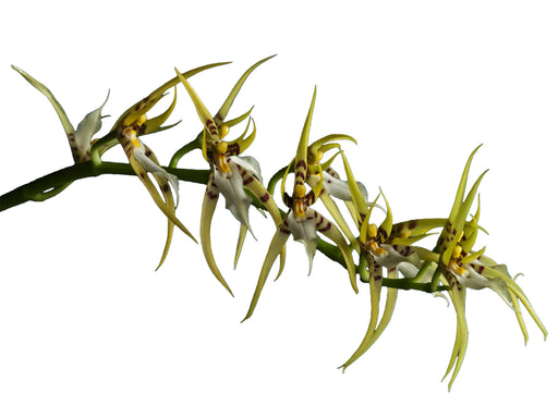 This distinctive Brassia hybrid displays exceptional spider-like flowers with elongated, narrow petals and sepals in yellow-green tones adorned wit...