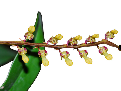 This unifoliate epiphytic orchid species is celebrated for its compact growth habit and distinctive fragrant flowers that emerge from small pseudob...