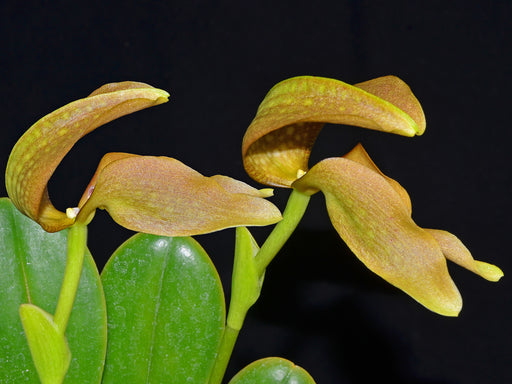 This small, hot to cool-growing epiphyte, features ovoid pseudobulbs, each bearing a single apical leaf. This species is often grown in pots or bas...