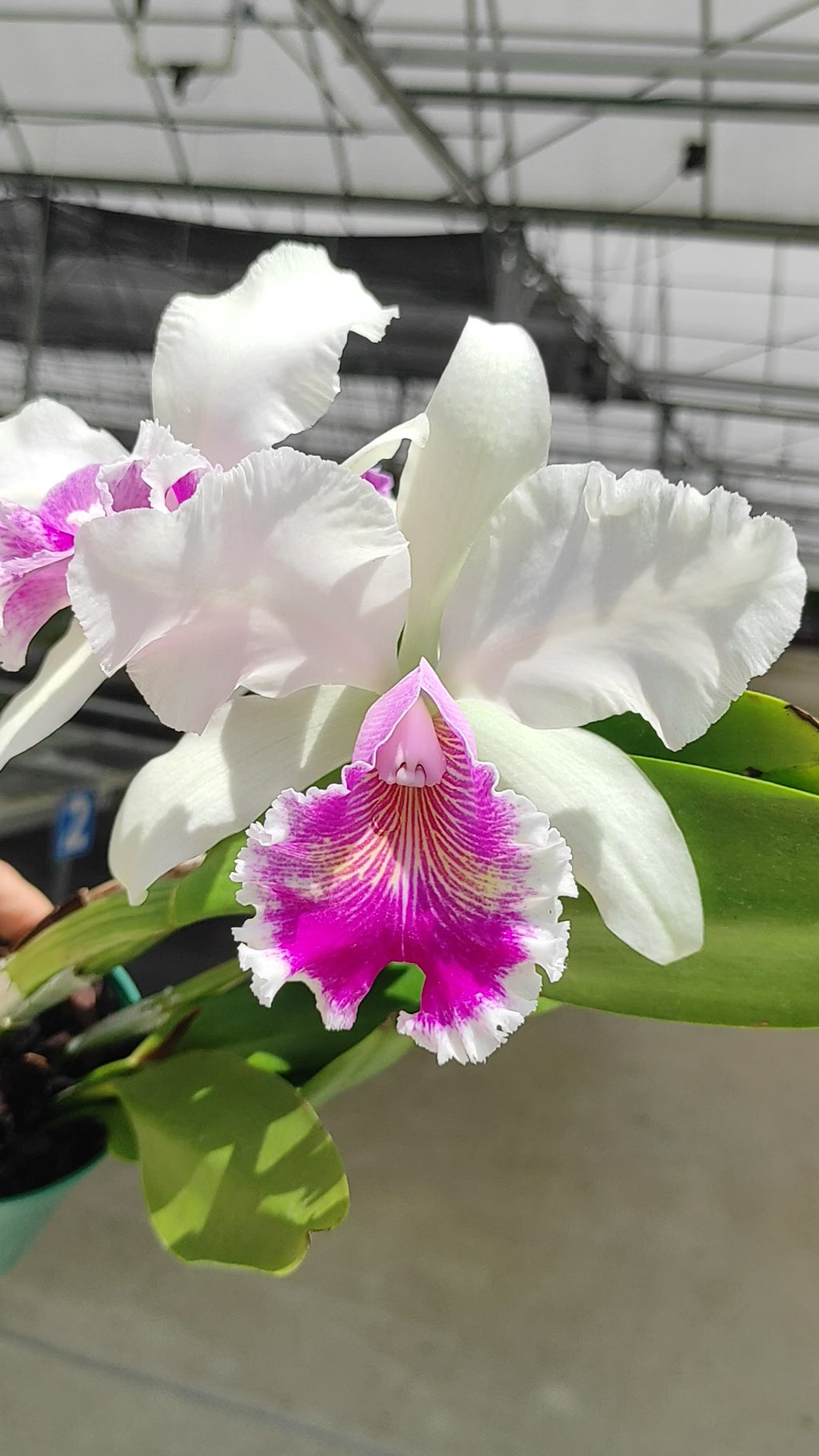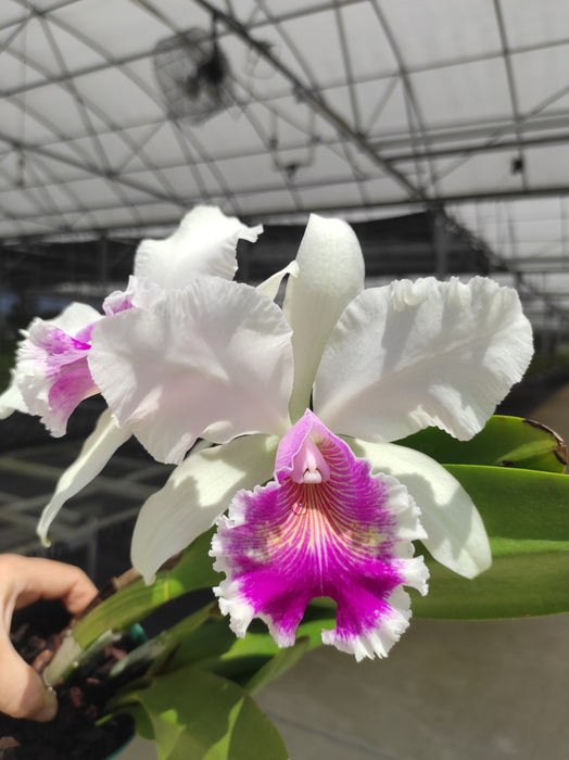 This variety is highly sought after among collectors due to its exceptional beauty, with large white flowers and a striking pink lip.