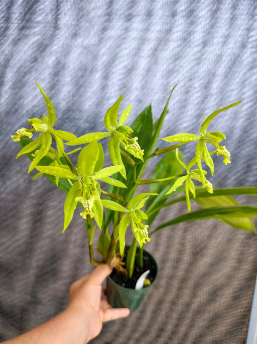 This charming epiphytic orchid native to Myanmar and Thailand, produces elegant yellow-green flowers with distinctive brown-marked labelos, creatin...