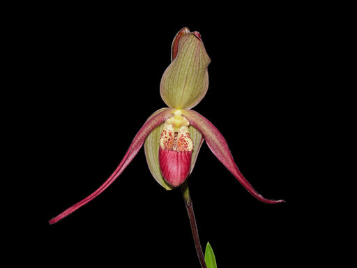 This exceptional slipper orchid hybrid, a cross between Phragmipedium richteri and Phragmipedium caudatum, stands as a testament to selective breed...