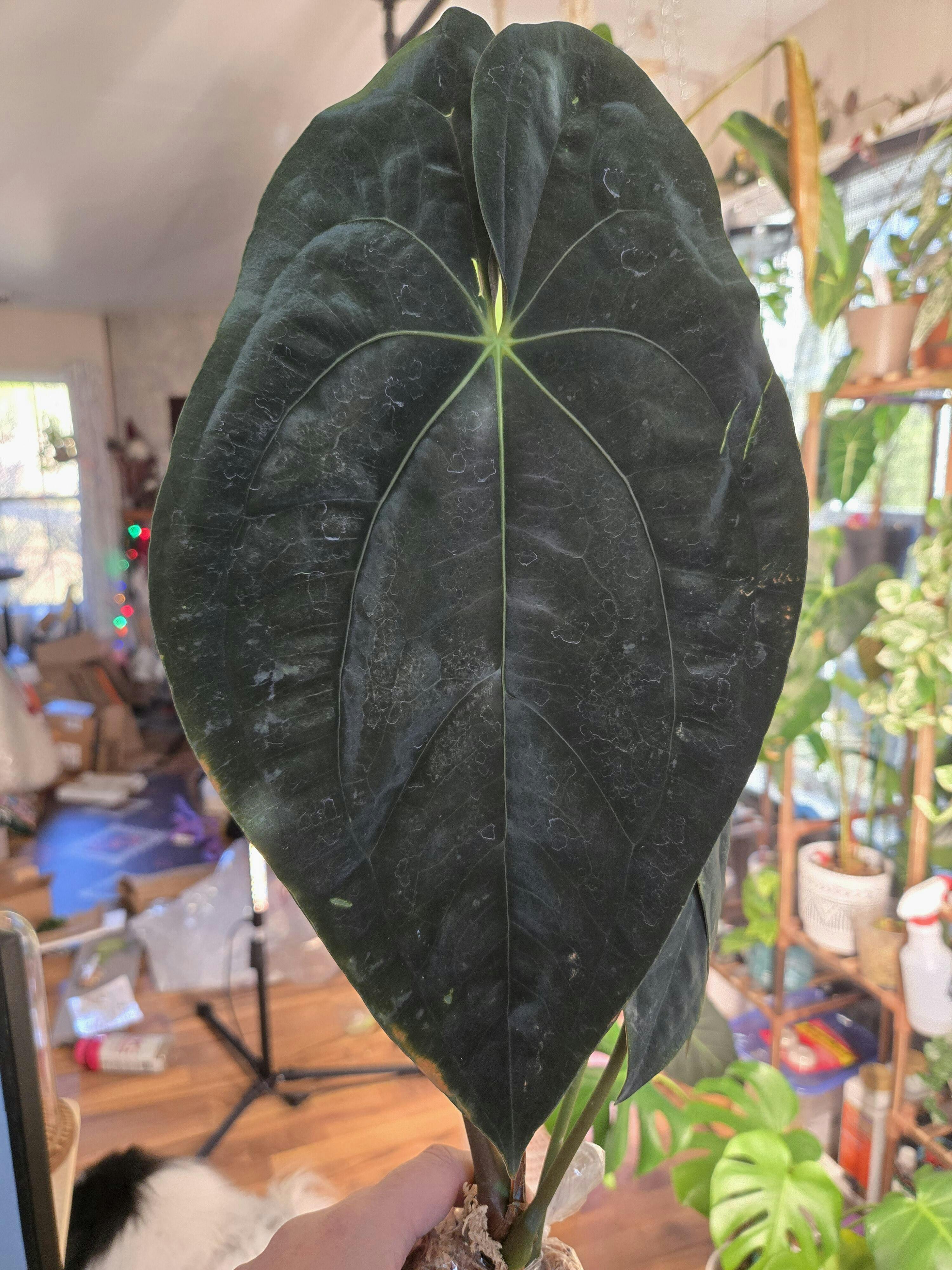 This hybrid between Anthurium forgetii and Anthurium papillilaminum showcases broad heart-shaped leaves with smooth glossy surface and prominent bright green venation that creates beautiful contrast against the rich dark green background.
