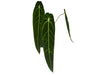 The Anthurium warocqueanum, or "Queen Anthurium," is prized for its long, velvety dark green leaves with striking silvery veins. This epiphytic aroid thrives in well-aerated substrate and needs consistently high humidity to develop its impressive foliage.