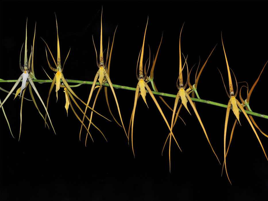 Plant Characteristics: Features long, slender pseudobulbs with narrow, arching leaves forming an elegant fountain shape. It produces long, branching spikes of spider-like yellow-green flowers marked with reddish-brown stripes and spots, creating a striking and dramatic display.