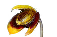 This orchid produces flowers approximately 3/8 inch (1.2 cm) in size. It is valued for its miniature size and distinctive structure within the Bulbophyllum genus.