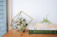 Seven-sided, gold-plated terrariums with Tillandsia Red Abdita, Ionantha, River Rocks, Reindeer Moss, and a Small Xerographica. They sit beautifully on their triangular bases for your home or workspace. Also makes a perfect gift!
