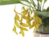 It blooms with small, bright orange flowers (about 0.2 inches or 5 mm). The sepals are fleshy, and the petals and lip are noticeably long and fimbriate (fringed), giving the tiny flower a textured appearance.